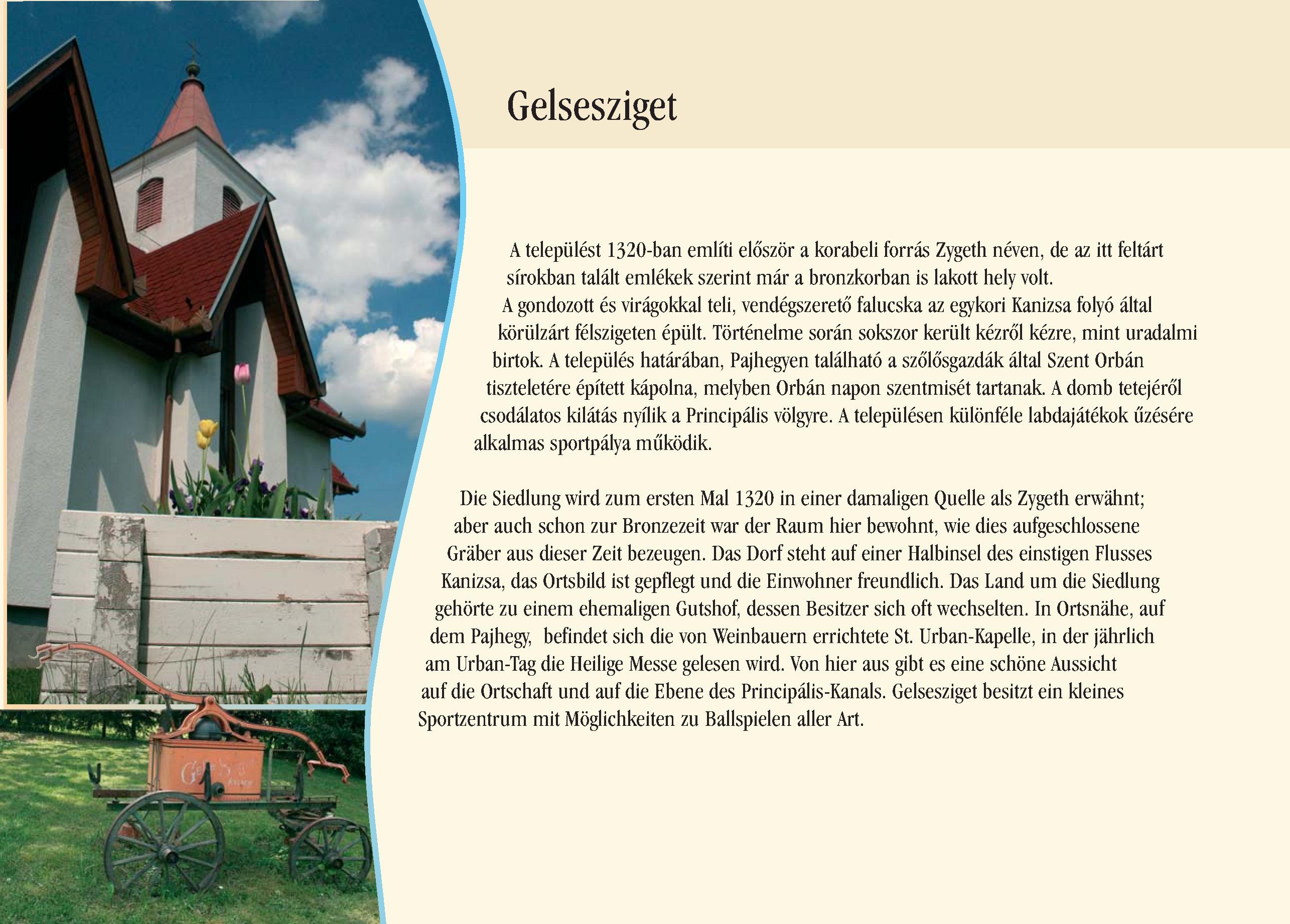 Nyilvános 2219 | 7919 | Gelsesziget | Die Siedlung wird zum ersten Mal 1320 in einer damaligen Quelle als Zygeth erwähnt; aber auch schon zur Bronzezeit war der Raum hier bewohnt, wie dies aufgeschlossene Gräber aus dieser Zeit bezeugen. Das Dorf steht auf einer Halbinsel des einstigen Flusses Kanizsa, das Ortsbild ist gepflegt und die Einwohner freundlich. Das Land um die Siedlung gehörte zu einem ehemaligen Gutshof, dessen Besitzer sich oft wechselten. In Ortsnähe, auf dem Pajhegy, befindet sich die von Weinbauern errichtete St. Urban-Kapelle, in der jährlich am Urban-Tag die Heilige Messe gelesen wird. Von hier aus gibt es eine schöne Aussicht auf die Ortschaft und auf die Ebene des Principális-Kanals. Gelsesziget besitzt ein kleines Sportzentrum mit Möglichkeiten zu Ballspielen aller Art. Dieses Text stammt von: Pannonhát tájpark prospektus 2006. Web: http://www.pannonhat.hu/ (auch in Deutsch) |
