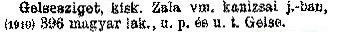 Nyilvános 2116 | 5781 | Cím: Révai nagy lexikona | Alcím: az ismeretek enciklopédiája Kiadás: Budapest : Révai testvérek, [1911]- Kötetei: 1. köt., A - Arany 2. köt., Arány - Beke 3. köt., Béke - Brutto 4. köt., Bratus - Csát 5. köt., Csata - Duc 6. köt., Duc - Etele 7. köt., Stelka - Földöv 8. köt., Földpálya - Gres 9. köt., Gréc - Herold 10. köt., Hérold - Jób 11. köt., Jób - Nontur 12. köt., Kontúr - Lovas 13. köt., Lovas - Mons 14. köt., Mens - Ottó 15. köt., Ottó - Racine 16. köt., Racine - Sodoma 17. köt., Sodoma - Tarján 18. köt., 19. köt., Vár - Zsüri | Kiegészítés Aachen - Beöthy 20. köt., Kiegészítés: Bér - Zsolt ETO jelzet: 03=945.11 Szakjelzet: 030 Cutter: R 62 Nyelv: magyar GELSESZIGET Gelsesziget, kisk. Zala vm. kanizsai j.-ban, (1910) 396 magyar lak., u. p. és u. t. Gelse. |