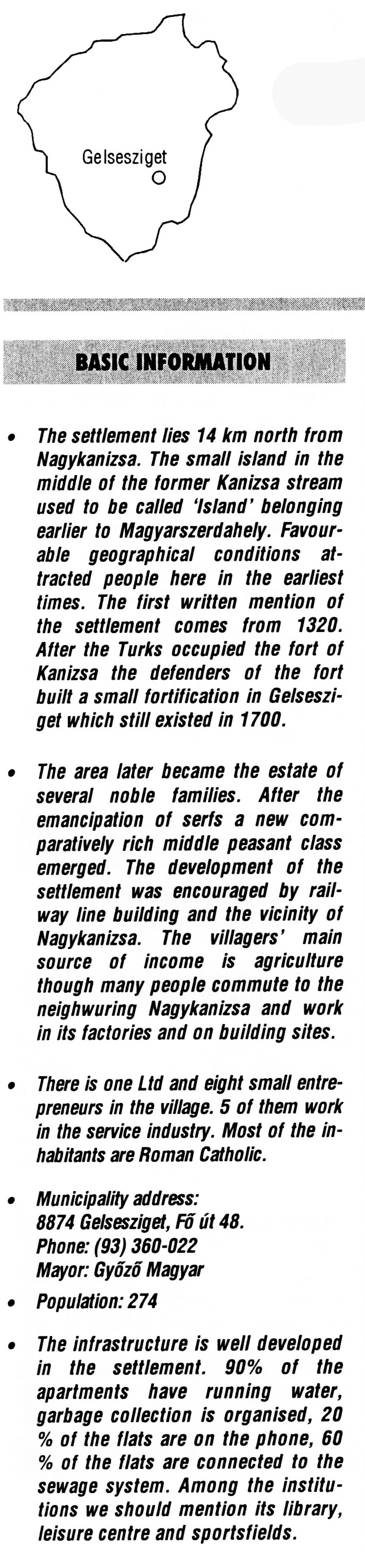 Nyilvános 2241 | 6447 | Gelsesziget | BASIC INFORMATION • The settlement lies 14 km north from Nagykanizsa. The small island in the middle of the former Kanizsa stream used to be called \'Island\' belonging earlier to Magyarszerdahely. Favourable geographical conditions attracted people here in the earliest times. The first written mention of the settlement comes from 1320. After the Turks occupied the fort of Kanizsa the defenders of the fort built a small fortification in Gelsesziget which still existed in 1700. • The area later became the estate of several noble families. After the emancipation of serfs a new comparatively rich middle peasant class emerged. The development of the settlement was encouraged by railway line building and the vicinity of Nagykanizsa. The villagers\' main source of income is agriculture though many people commute to the neighwuring Nagykanizsa and work in its factories and on building sites. • There is one Ltd and eight small entrepreneurs in the village. 5 of them work in the service industry. Most of the inhabitants are Roman Catholic. • Municipality address: 8874 Gelsesziget, Fő út 48. Phone: (93) 360-022 Mayor: Győző Magyar • Population: 274 • The infrastructure is well developed in the settlement. 90% of the apartments have running water, garbage collection is organised, 20 % of the flats are on the phone, 60 % of the flats are connected to the sewage system. Among the institutions we should mention its library, leisure centre and sportsfields. This text came from the following book: Title: Handbook of Zala county (Zala megye kézikönyve) Series: County handbooks of Hungary (Magyarország megyei kézikönyvei) Chief editor: Hóbor József Publisher: (Hatvan), CEBA-Hungary Ltd, 1998 ETO: 908.439.121(035) ; 050.8(439.121) ISBN: 963-9089-18-2 Pages: 488-1040 p. Remark: Closed on: 1998. márc. 31. |