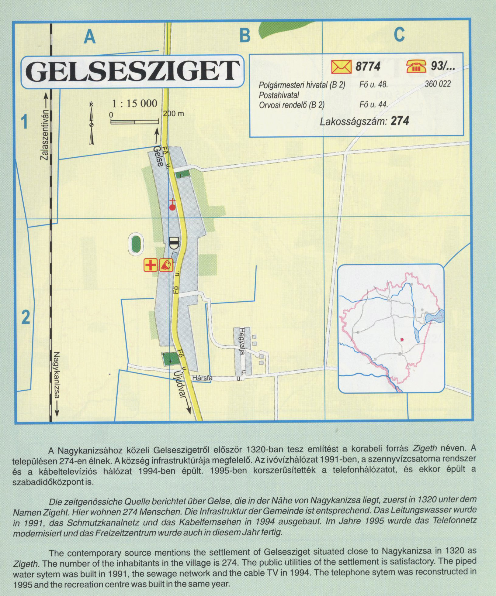 Nyilvános 2188 | 7439 | GELSESZIGET | A Nagykanizsához közeli Gelseszigetről először 1320-ban tesz említést a korabeli forrás Zigeth néven. A településen 274-en élnek. A község infrastruktúrája megfelelő. Az ivóvízhálózat 1991 -ben, a szennyvízcsatorna rendszer és a kábeltelevíziós hálózat 1994-ben épült. 1995-ben korszerűsítették a telefonhálózatot, és ekkor épült a szabadidőközpont is. Die zeitgenössiche Quelle berichtet über Gelse, die in der Nahe von Nagykanizsa liegt, zuerst in 1320 unter dem Namen Zigeht. Hier wohnen 274 Menschen. Die Infrastruktur der Gemeinde isi entsprechend. Das Leitungswasser wurde in 1991, das Schmutzkanalnetz und das Kabelfernsehen in 1994 ausgebaut. lm Jahre 1995 wurde das Telefonnetz modernisiert und das Freizeitzentrum wurde auch in diesem Jahr fertig. The contemporary source mentions the settlement of Gelsesziget situated close to Nagykanizsa in 1320 as Zigeth. The number of the inhabitants in the village is 274. The public Utilities of the settlement is satisfactory. The piped water sytem was built in 1991, the sewage network and the cable TV in 1994. The telephoné sytem was reconstructed in 1995 and the recreation centre was built in the same year. A részlet a következő kiadványból származik/Die Teile stammen vom volgenden Buch/This text came from the following book: Cím/Titel/Title: Zala megye településeinek atlasza - 257 település részletes térképe/Atlas der Komitat Zala - 257 Detailte Siedlungskarten/Zala county\'s Atlas - 257 settlement maps. Közreműködő/contributor: Lackner László (1943) (fotó) Kiadás/Ausgabe/Publisher: Gyula : HISZI-MAP, 1997 Sorozat/Serie/Series: Indulástól - megérkezésig... ETO: 912(439.121-2) ; 908.439.121 Cutter: Z 19 ISBN: 963-610-025-4 Oldalszám/Seiten/Pages: 323, 81 p. Megjegyzés/Note: Lezárva/Abgeschlossen am/Closed am: 1997. máj. 30. |