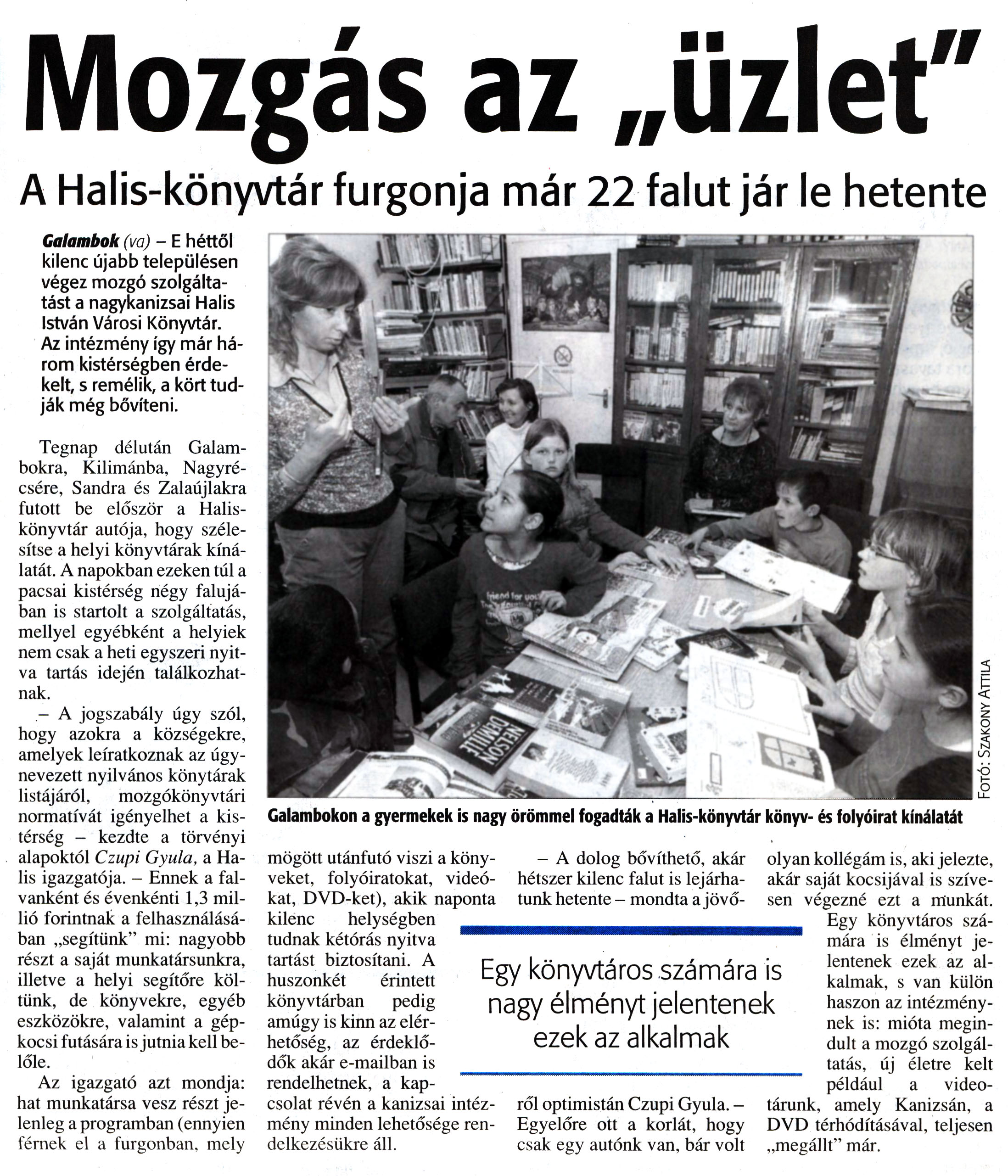 Nyilvános 7523 | 15167 | Zalai Hírlap 2008. március 14. 4. oldal - Mozgás az üzlet | Mozgás az „üzlet" A Halis-könyvtár furgonja már 22 falut jár le hetente Galambok (va) - E héttől kilenc újabb településen végez mozgó szolgáltatást a nagykanizsai Halis István Városi Könyvtár. Az intézmény így már három kistérségben érdekelt, s remélik, a kört tudják még bővíteni. Tegnap délután Galambokra, Kilimánba, Nagyrécsére, Sandra és Zalaújlakra futott be először a Halis-könyvtár autója, hogy szélesítse a helyi könyvtárak kínálatát. A napokban ezeken túl a pacsai kistérség négy falujában is startolt a szolgáltatás, mellyel egyébként a helyiek nem csak a heti egyszeri nyitva tartás idején találkozhatnak. - A jogszabály úgy szól, hogy azokra a községekre, amelyek leiratkoznak az úgynevezett nyilvános könytárak listájáról, mozgókönyvtári normatívát igényelhet a kistérség — kezdte a törvényi alapoktól Czupi Gyula, a Halis igazgatója. - Ennek a falvanként és évenkénti 1,3 millió forintnak a felhasználásában „segítünk" mi: nagyobb részt a saját munkatársunkra, illetve a helyi segítőre költünk, de könyvekre, egyéb eszközökre, valamint a gépkocsi futására is jutnia kell belőle. Az igazgató azt mondja: hat munkatársa vesz részt jelenleg a programban (ennyien férnek el a furgonban, mely mögött utánfutó viszi a könyveket, folyóiratokat, videókat, DVD-ket), akik naponta kilenc helységben tudnak kétórás nyitva tartást biztosítani. A huszonkét érintett könyvtárban pedig amúgy is kinn az elérhetőség, az érdeklődők akár e-mailban is rendelhetnek, a kapcsolat révén a kanizsai intézmény minden lehetősége rendelkezésükre áll. - A dolog bővíthető, akár hétszer kilenc falut is lejárhatunk hetente - mondta a jövőről optimistán Czupi Gyula. - Egyelőre ott a korlát, hogy csak egy autónk van, bár volt olyan kollégám is, aki jelezte, akár saját kocsijával is szívesen végezné ezt a munkát. Egy könyvtáros számára is élményt jelentenek ezek az alkalmak, s van külön haszon az intézménynek is: mióta megindult a mozgó szolgáltatás, új életre kelt például a video-tárunk, amely Kanizsán, a DVD térhódításával, teljesen „megállt" már. |